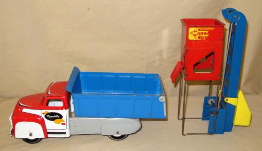 Truck is 13" long, Loader is about 11" tall, both nice originals with some wear, 2x the money, decal flaking on loader