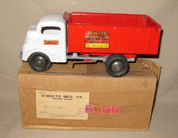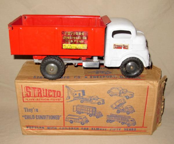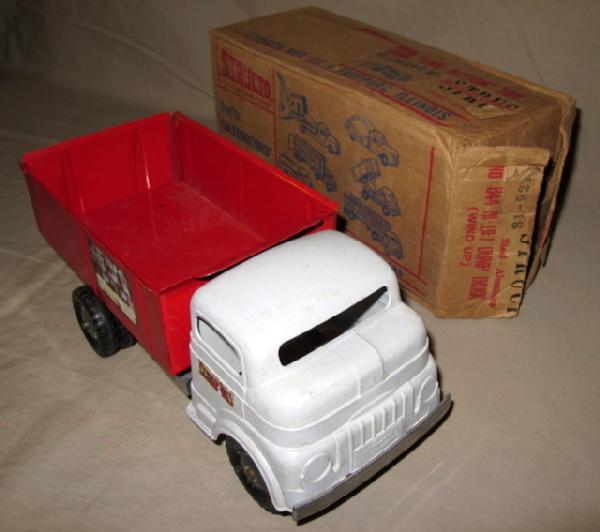 Has windup Mech and works, Toy is near mint, no play wear, but decals are starting to discolor, box is nice with some light crushing, marked "844 Hi-Lift Dump Truck"