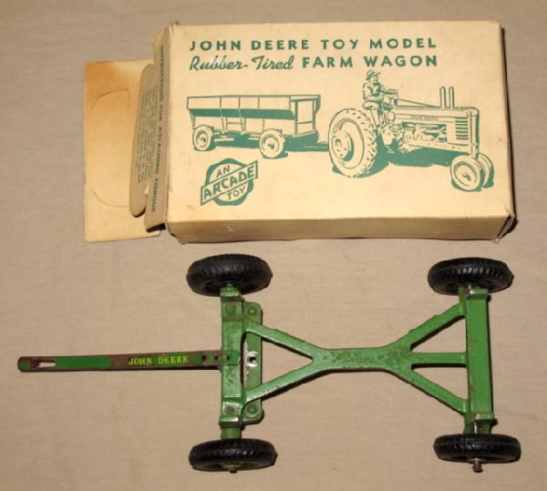 Cast iron gear has nice original paint, 90% or so, tongue has quite abit of wear, tires look good. Box has great graphics, very square, one end flap is torn off, but included, overall box rates 8 condition. We have never sold a boxed version of this before, super scarce!
