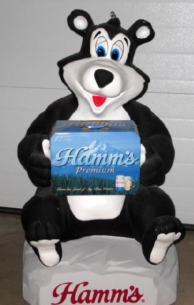 Super piece, very clean, probably never used in a bar or liquor store, 3' tall, all 3-D, holding an empty box of Hamm's, Classic piece!