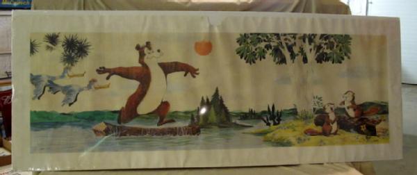 has some damage, but overall is nice, very large, 5'x23", shrink-wrapped to a board for display