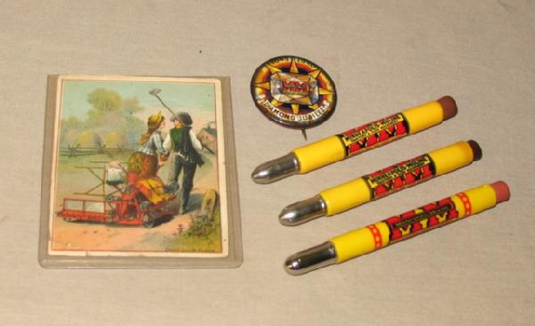 Pencls are all nice, Button has some discoloration, Trade card is nice, sells 5x the money