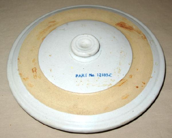 Nice original, no chips or cracks, good lid, inside glaze has been eaten away from the lye
