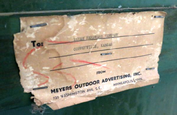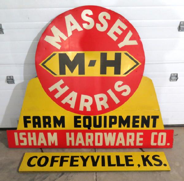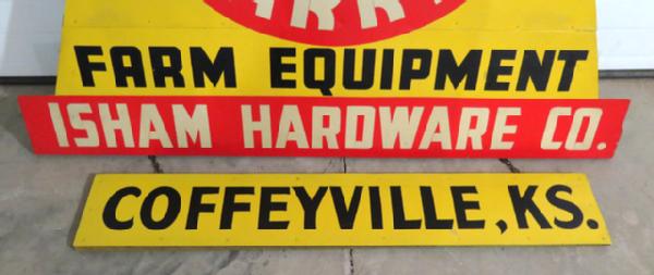 4' tall, 5' wide plus 4' wide rider at the bottom. Overall condition is close to a 9! Light Aluminum sign, wood back, with reflective lettering. In 1892, the Coffeyville, KS bank was being robbed by the infamous "Dalton Gang". While robbing the back, the town's people took the brand new guns and shells of the rack at the next door hardware store--Isham Hardware--and took down the Dalton gang! The store is still in business today. Google "Isham Hardware" and read the whole story. Super piece of history!
