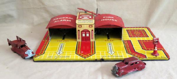 Tin-litho, station has quite a bit of wear and scratches, includes 2 small pressed steel cars, base measures 17"x11", sells as a set