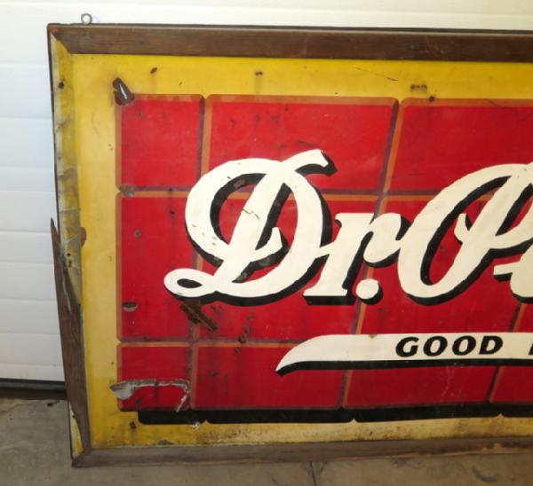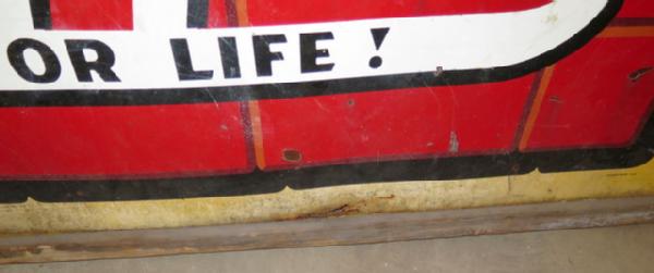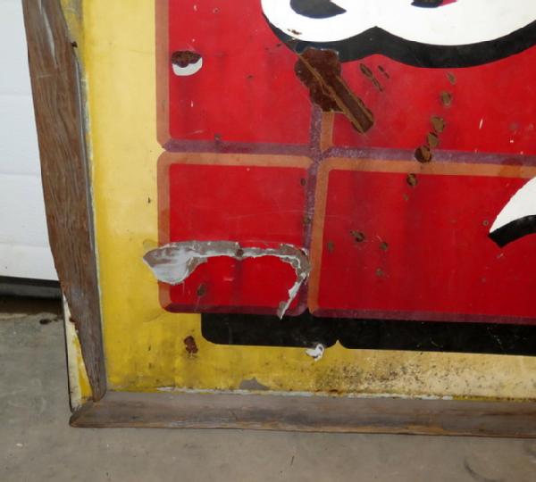 6' long, 3' tall, wood frame is mostly missing on the left edge, has some rust, wear and fading, but a hard to find sign, rates 6.75 condition