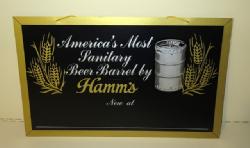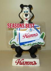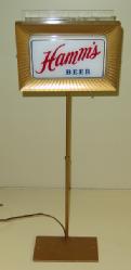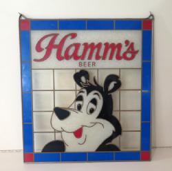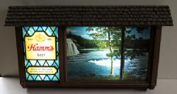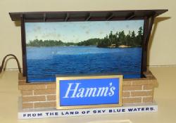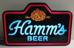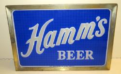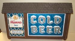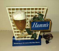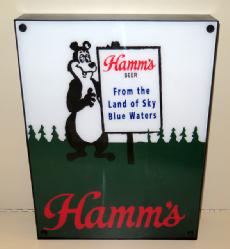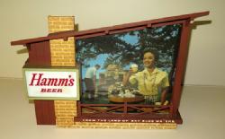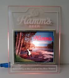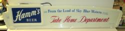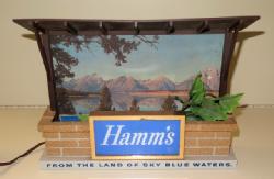 Neat sign designed to sit atop a glass door cooler, 51"x11", has a few scuffs and scratches, but lights up and looks good; we have never seen this Hamm's sign before