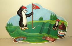 Neat sign designed to stand up behind the cash register, stands about 20" high, sign is about 7"x10", works, believe the gold color has been restored on this sign, looks good and hard to find