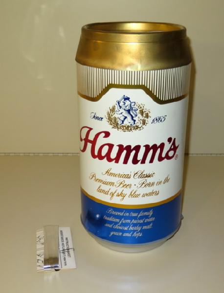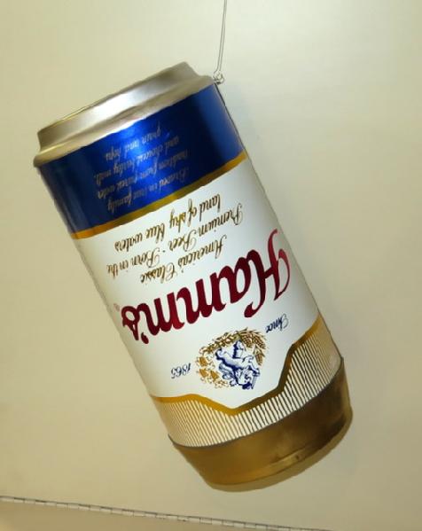 15" can hangs from the ceiling with a twirling ribbon making it look like the beer is pouring, never used, nice piece, did not test