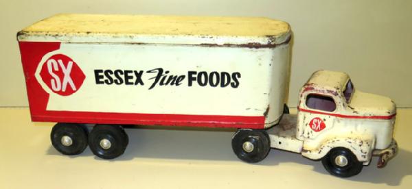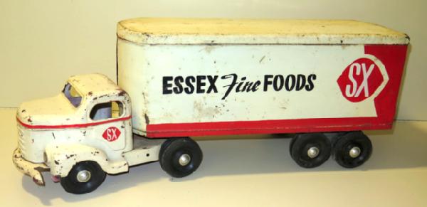 made in Canada, about 28" long, a little bigger than Tonka Trucks, has quite abit of wear and some rust on the seams at the front of the trailer, might clean up some