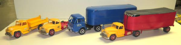 Blue one is an old repaint, other has had the top painted black, both have some warping and wear, includes a dump truck too that is warped, all to go for one bid