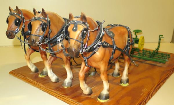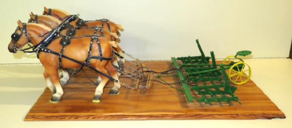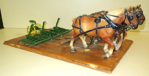 Breyer horses, full custom harness, implement is made of metal and looks good, cart is a little crude, but rest looks nice, all mounted to a board