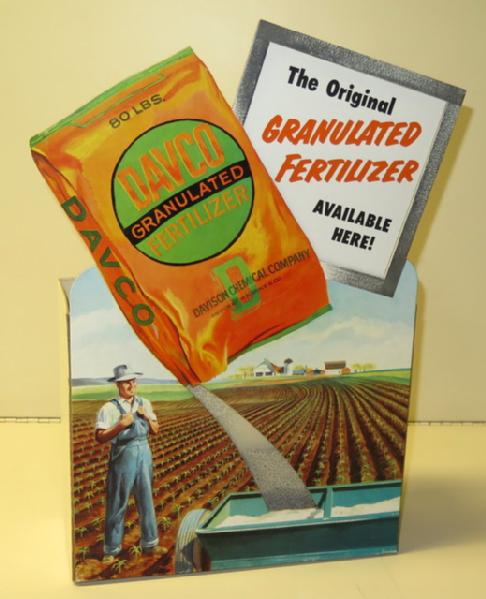 Super piece, made of heavy cardboard, super color and graphics; has a wheel inside with real granules of fertilizer that spins to look like the fertilizer is coming out of the bag; never used, cord is still wrapped from the factory! 17.5" tall, 13" wide; super piece