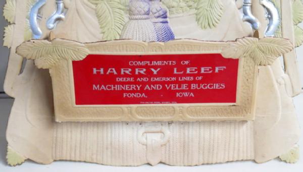 Beautiful piece! 15"x10", has a piece that sticks out that was designed to hold envelopes I believe; advertises "Compliments of Harry Leef--Deere & Emerson Lines of Machinery & Velie Buggies--Fonda, IA". No date or calendar pad, but has to be 19-teen's era. Beautiful condition overall, probably 1 of a kind!