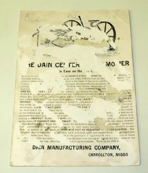 has the advertising on the back, but was removed from a scrape book, so has quite abit of graphic loss, 8.5"x5.75"