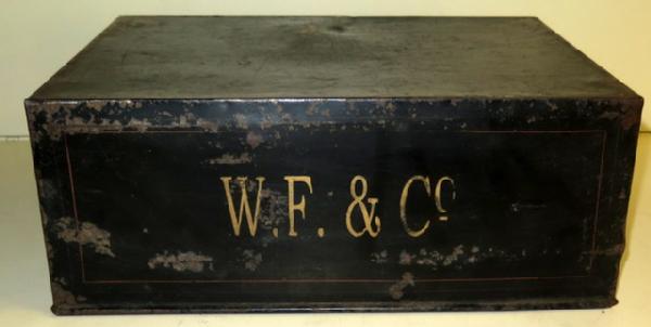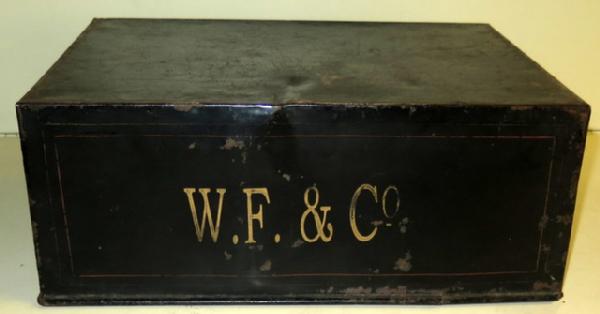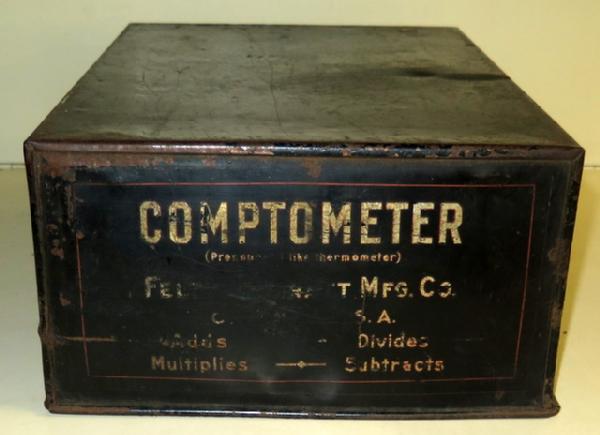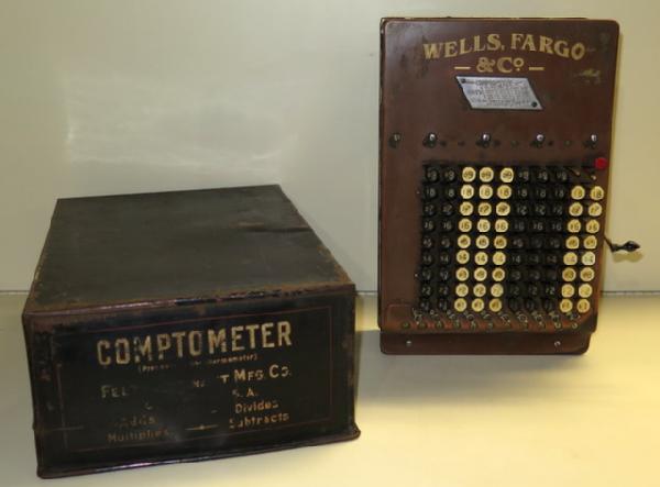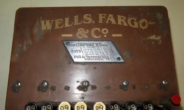 unique piece, early form of adding machine, nicely marked on the cover and the machine from Wells, Fargo, & Co, early 1900's piece, 15" long, heavy, great patina & finish