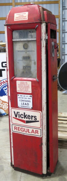 old original to restore, has the guts inside, pretty straight and complete, older repaint, great art-deco design and a hard to find pump!