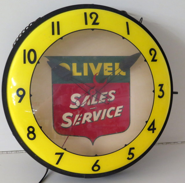 16" diam, very clean and works good, plastic face, large logo in the middle; super rare & highly desirable clock;