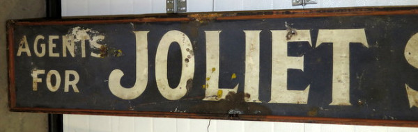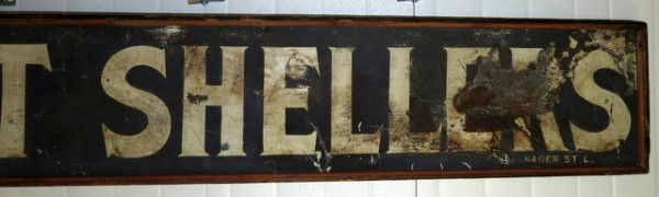 8' long, 1' tall, wood frame, has some pretty heavy paint loss and wear, but an early 1900's sign, has the Smaltz crushed glass paint