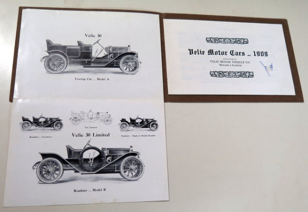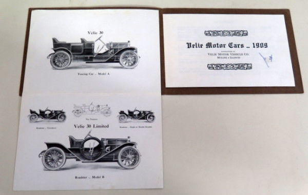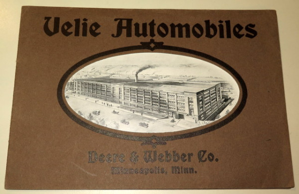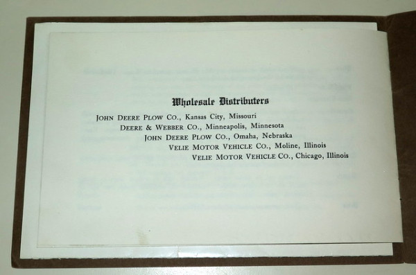 8 pages, plus a found out first page, diecut cover; condition is very nice with only minimal wear; I believe these are the first two pieces of Velie literature that we have ever sold that have the connection to "DEERE & WEBBER" right on the cover! What a find!