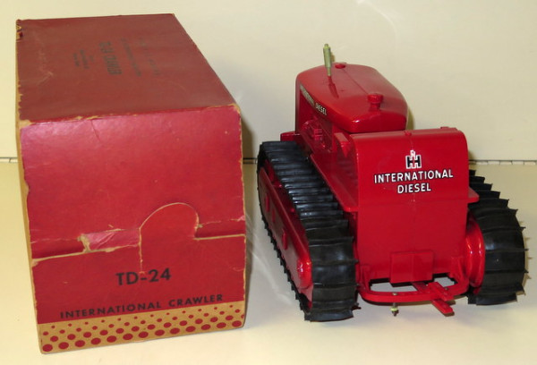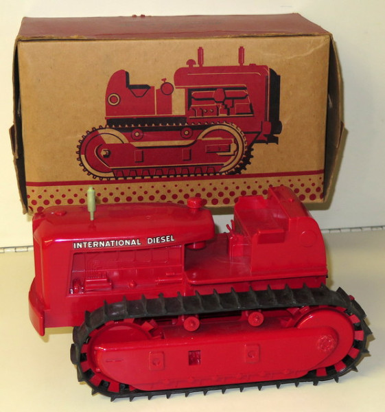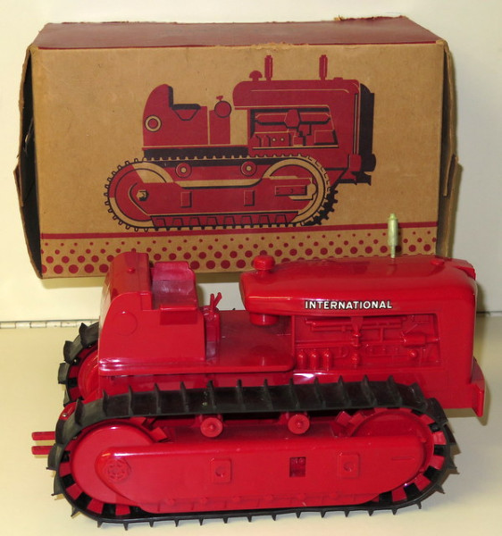 very nice, 1950's plastic toy, missing one stack and the model # decals, otherwise very clean and crisp toy; box is complete with some general wear; box variation is the brown cardboard version
