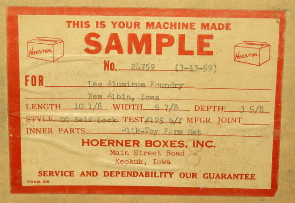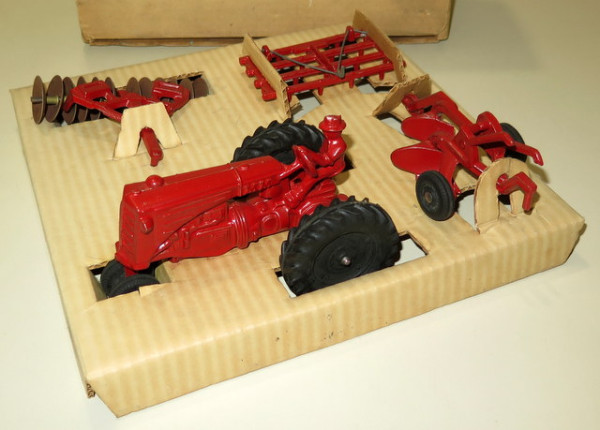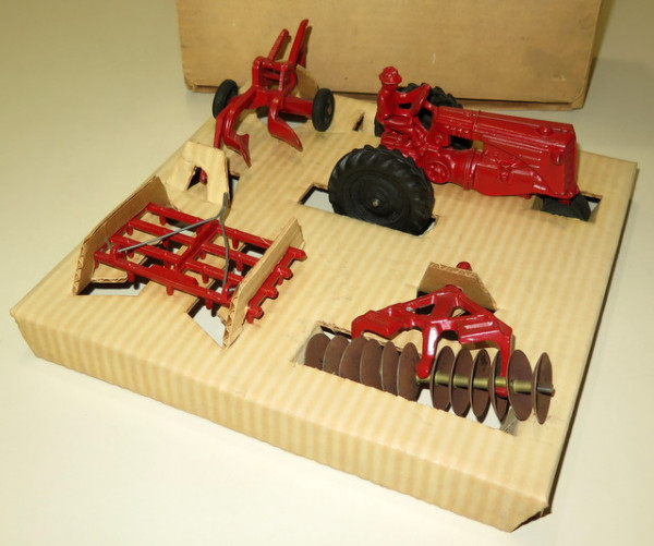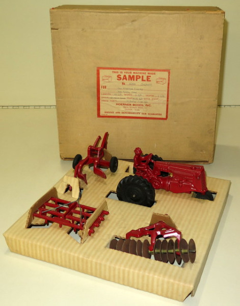 Very cool set, 1/32nd Scale Slik R, plow, Drag in disc with box liner in a closed box; box has a label on the top dated 3-13-59, from Hoerner Boxes of Keokuk, IA; made for the Lee Aluminum Foundry; this was the sample box sent to Lee for approval, very cool, one-of-a kind piece for the Farm Set or MM Collector!