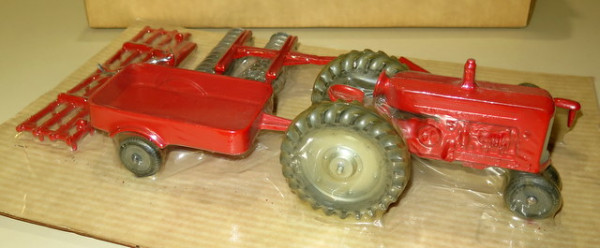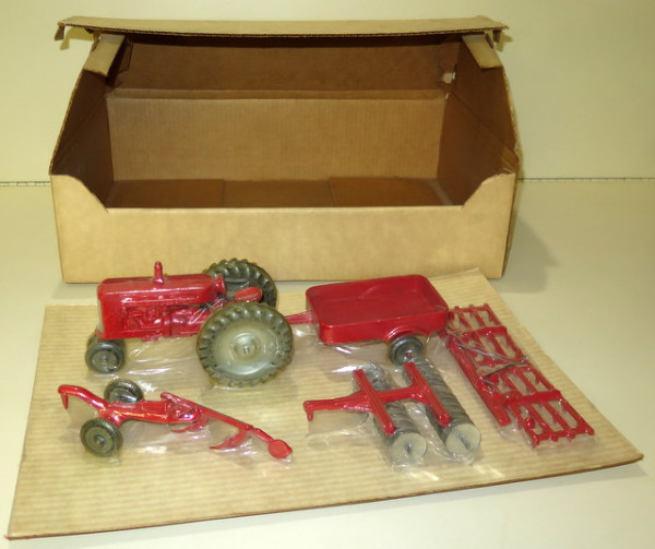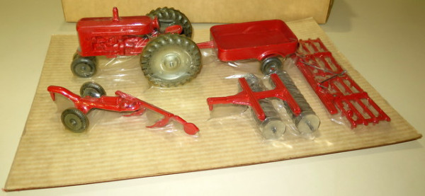 another unique set, about 1/32nd scale, this one has a more generic tractor, Wagon, tandem drag, tandem disc, and unique cylinder plow all shrink wrapped to a flat; no markings on this box, but was found with the previous lot, some soiling to the box and the tabs on the roof are a little beat up