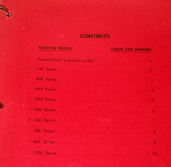 laminated pages, gives check lists to make sure dealer doesn't miss anything--oil, filters, etc, shows 1206, 806, 140, Cub's & more, nice shape