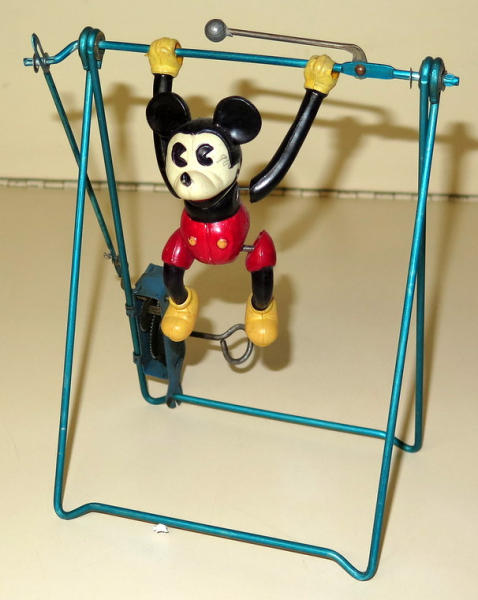 scarce piece, Mickey is made of very thin celluloid plastic, overall stands 7.5" tall, works with a little help, I see no damage on Mickey which is very scarce for this toy!