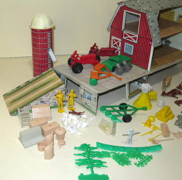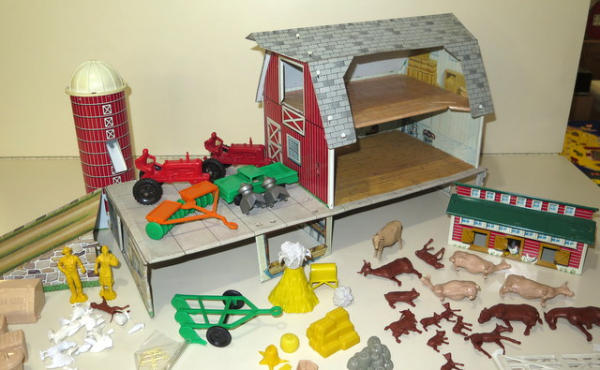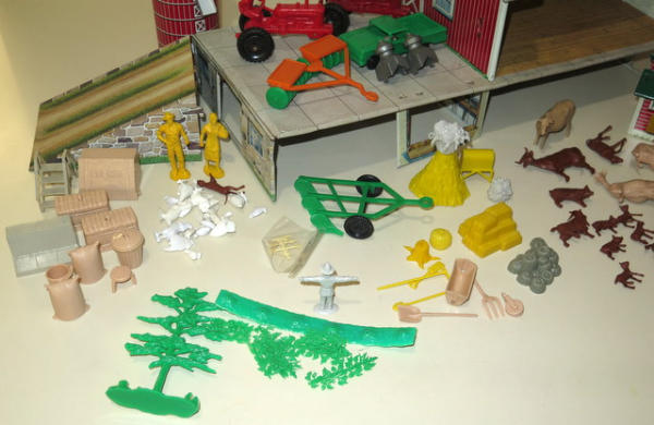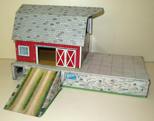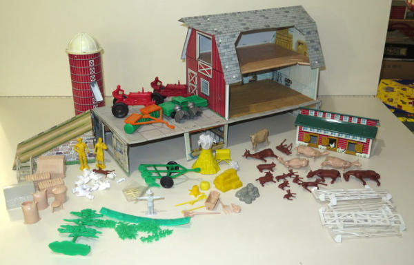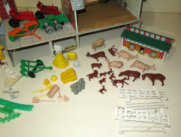 no box, barn is 22"x9", not marked but believe it's a Marx set, some light play wear