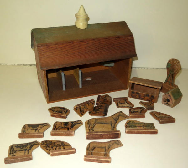 barn is 13"x8.5" has some wear and fading to the roof, don't know maker