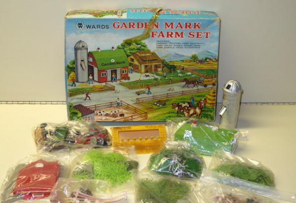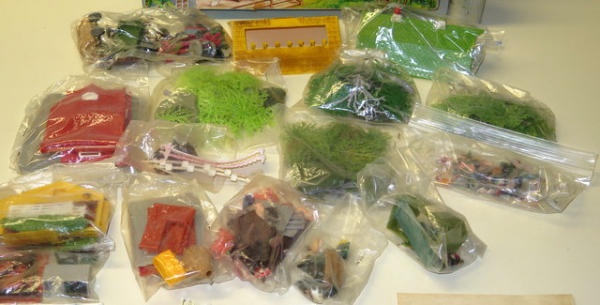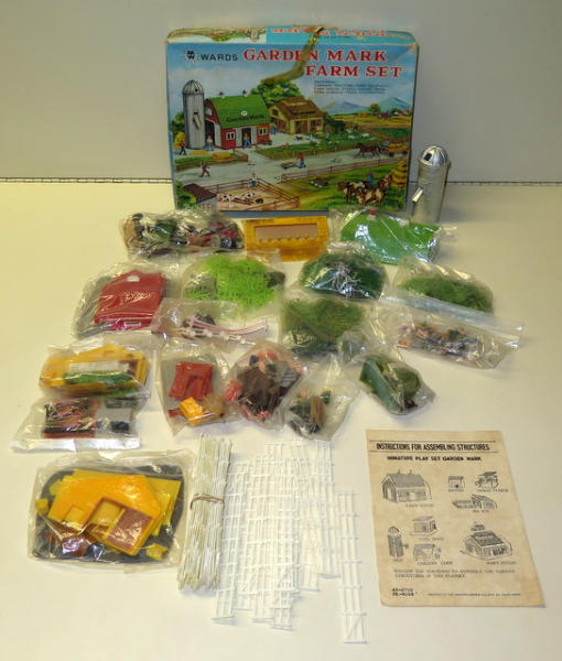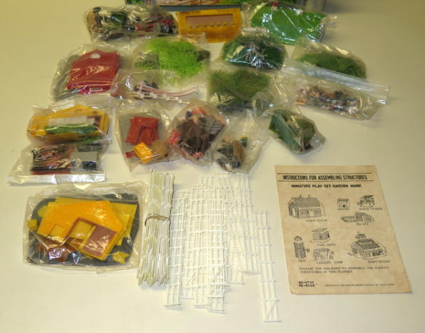 all plastic, box is 9"x12", has a tear on the top, lots of pieces