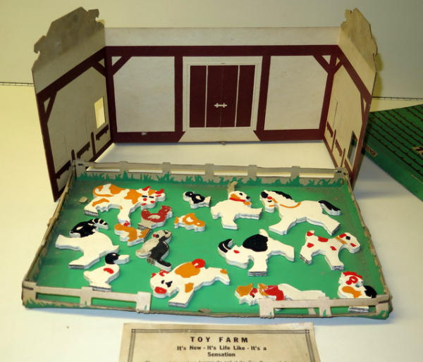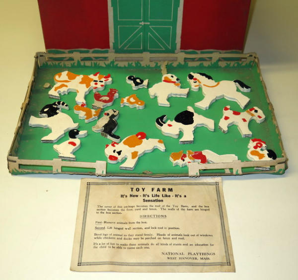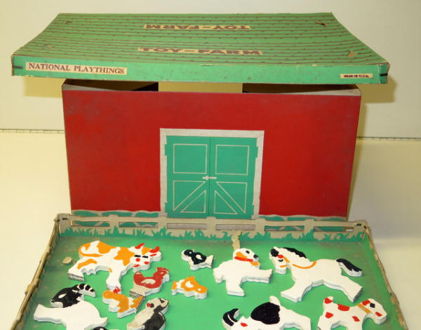 box is 15"x11", animals are wood, box is used as the fenced in yard, has some wear