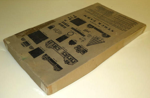 heavy cardboard, never assembled, out box has some tape and wear, box measures 16"x9.5"