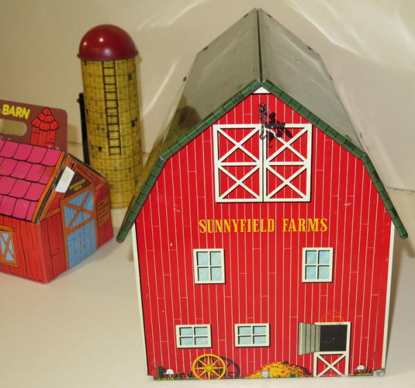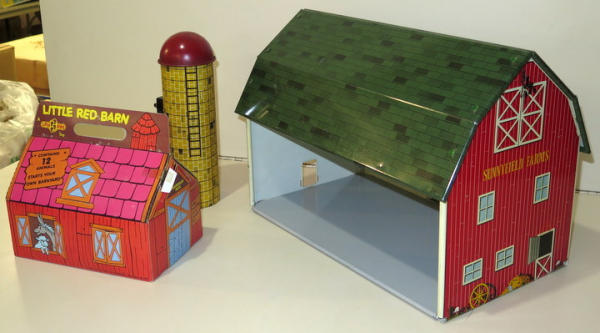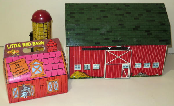 Animals are new in the package, barn is dark green shingle roof, 15" long, 9" wide