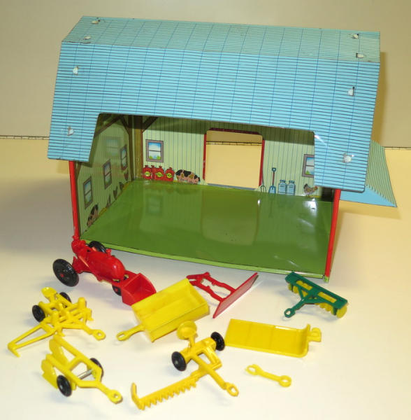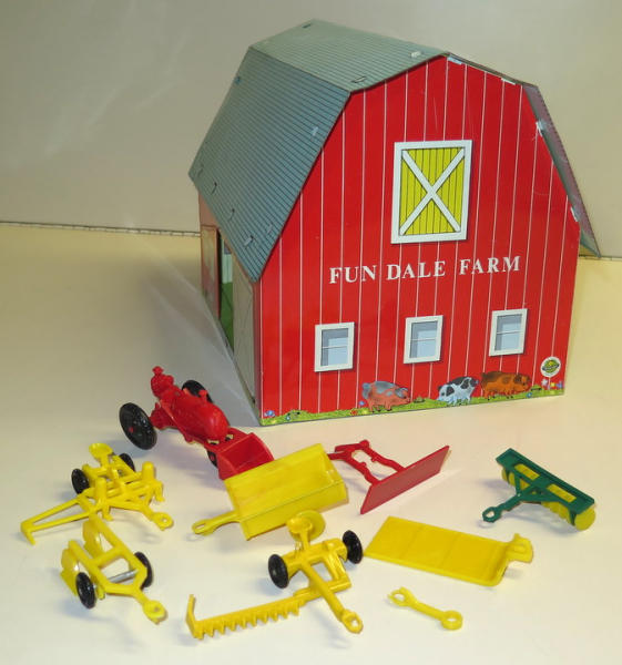 Barn is 13" long, toys are nice, barn has some wear, all to go