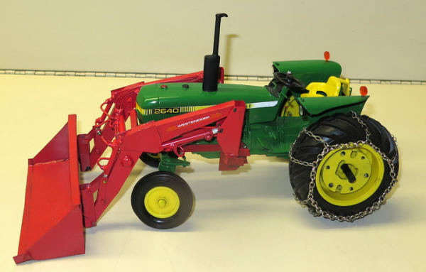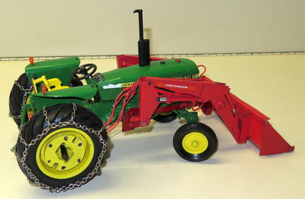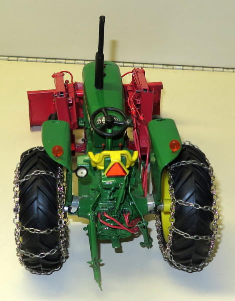 Ertl Tractor that has been heavily customized with lights, levers, 3pt, and more; Loader is all scratch built with lots of detail and very unique