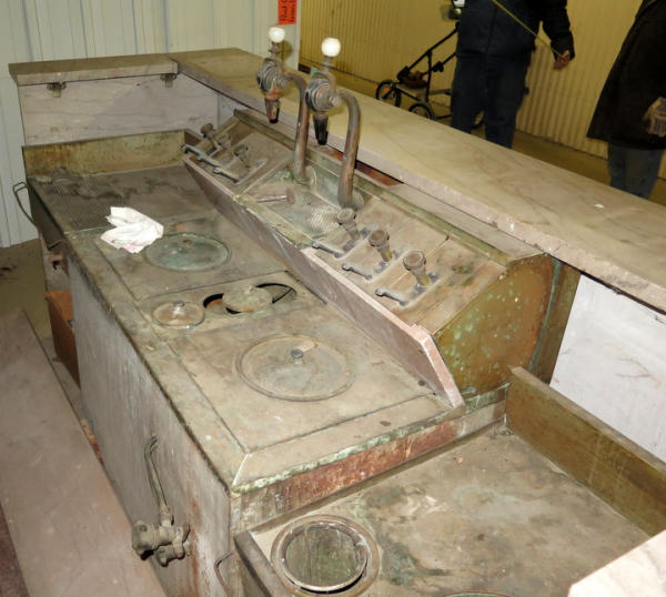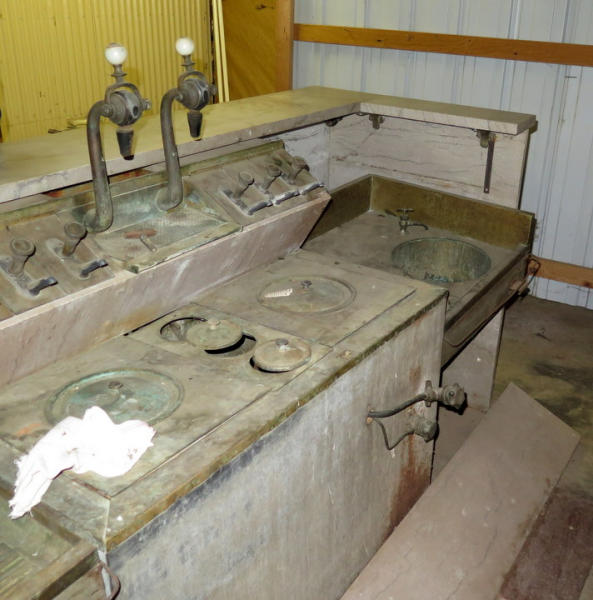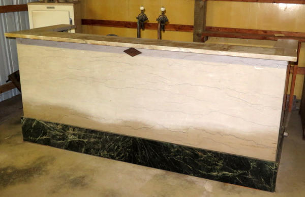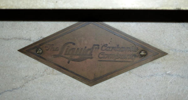 8' long, 33" deep, 43" tall, original brass name plaque from the Liquid Carbonite Co., includes the original fan, compressor and some extra marble pieces; this is a very heavy piece and fragile, professional help may be needed to move; the center piece for a Soda Fountain collector!