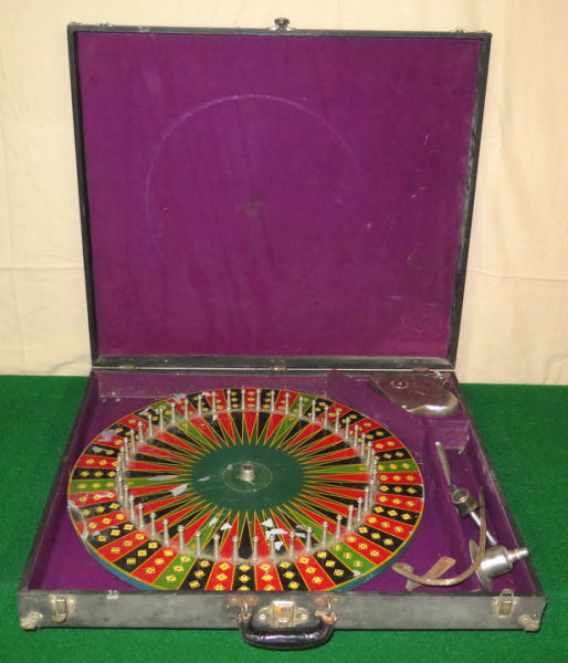 24" diam wheel, neat graphics, but has some large paint flaking and a piece that has been repaired on one side, neat piece, but needs some restoration work