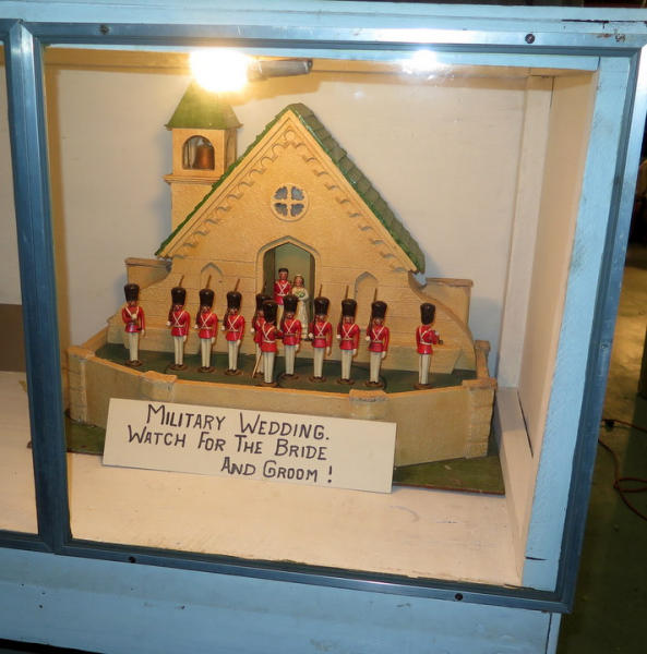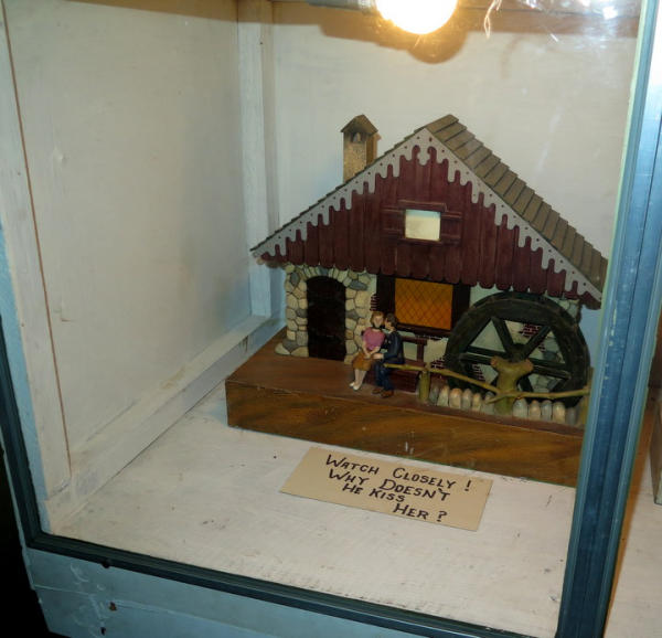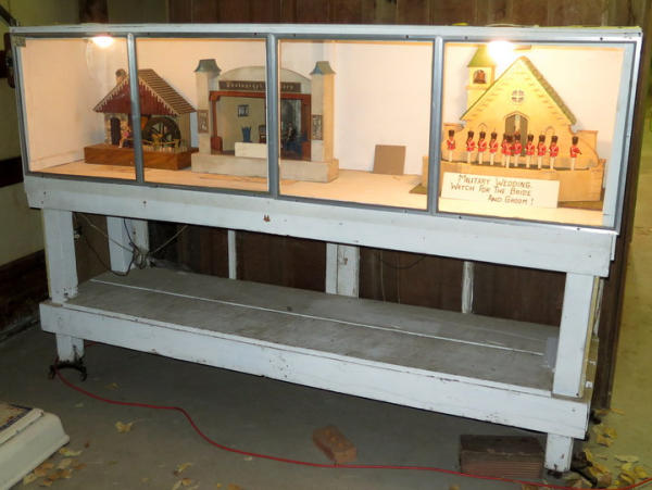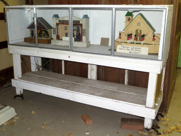 all hooked together so that when you drop a quarter in, they all run, in a homemade wood showcase, this is going to sell as an entire unit for one money, overall measures 97" long, 64.5" tall, 24.5" deep