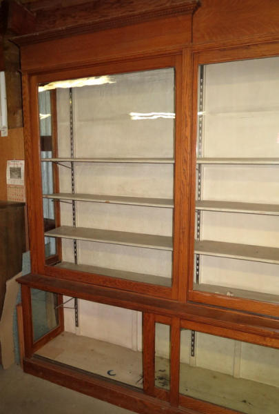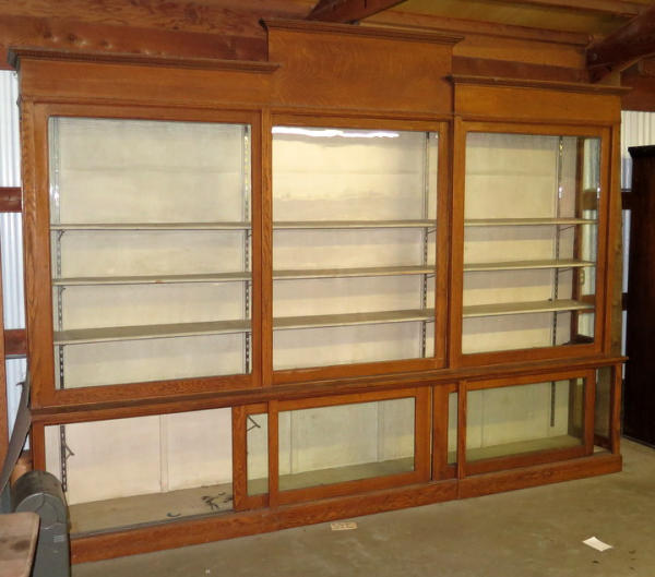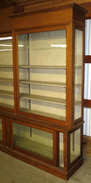 9' tall, 12' long, 21" deep; this is a single piece and does not come apart, all 3 doors slide, this came out of the Pukwana Drug Store, large and impressive piece to sell or display your antiques (located in main building)