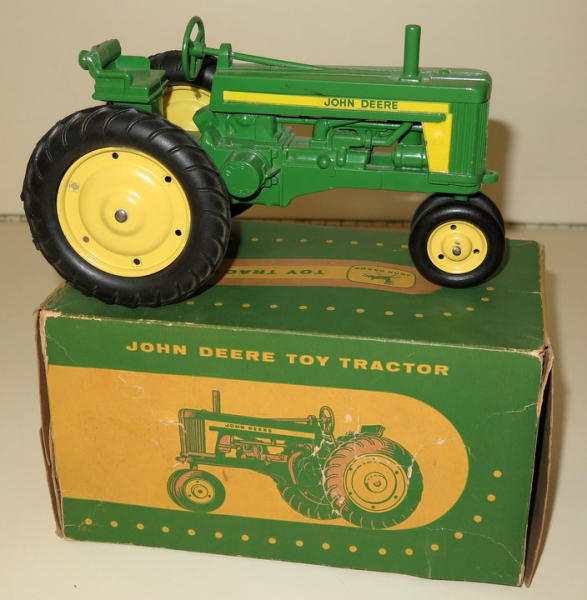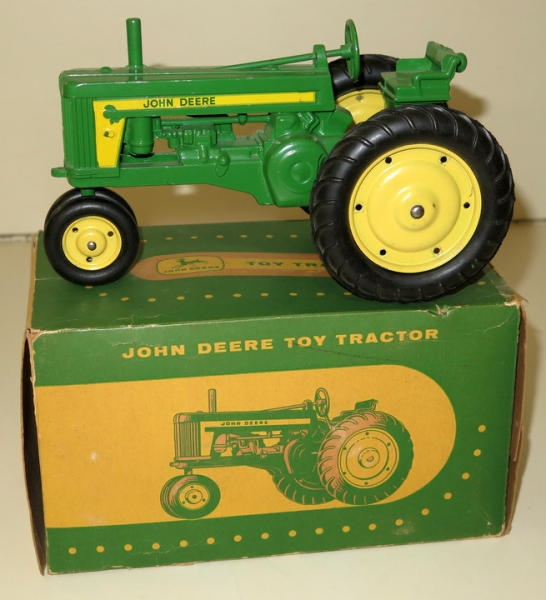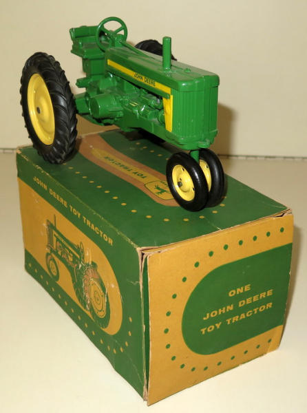 very nice original tractor, small flaking on the decal, otherwise near mint original; Box is complete, one main flap is torn off, but there, has some general wear, box overall rates 80% condition;