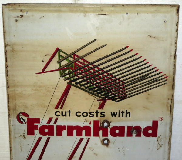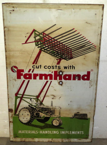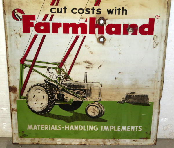 Killer graphics, has some pretty heavy fading and wear, 2 large holes in the middle; farm from mint, but a great sign, 28"x46"