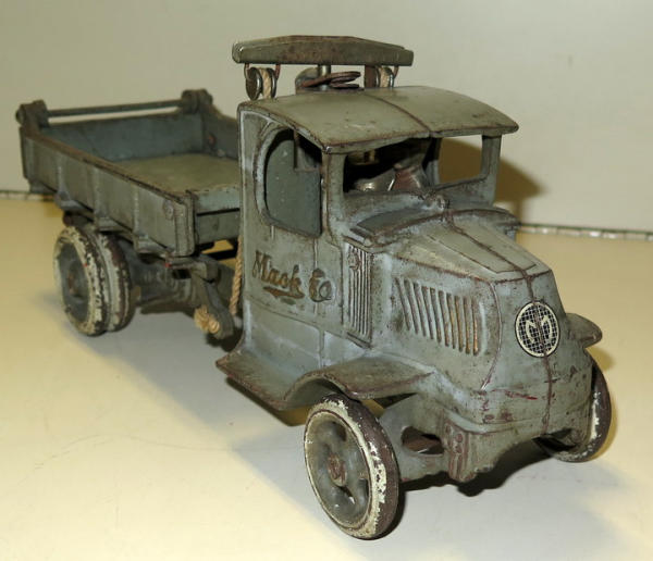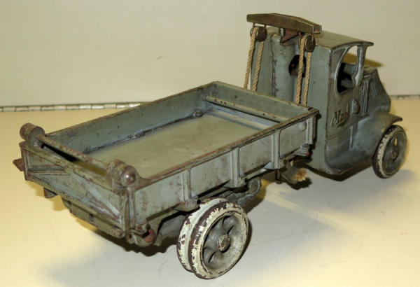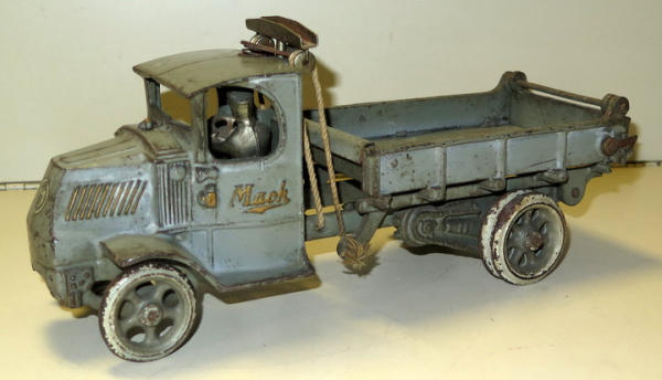 12" long, very good original paint, 80% or so, has the "M" decal on the grill still and the driver, nice piece
