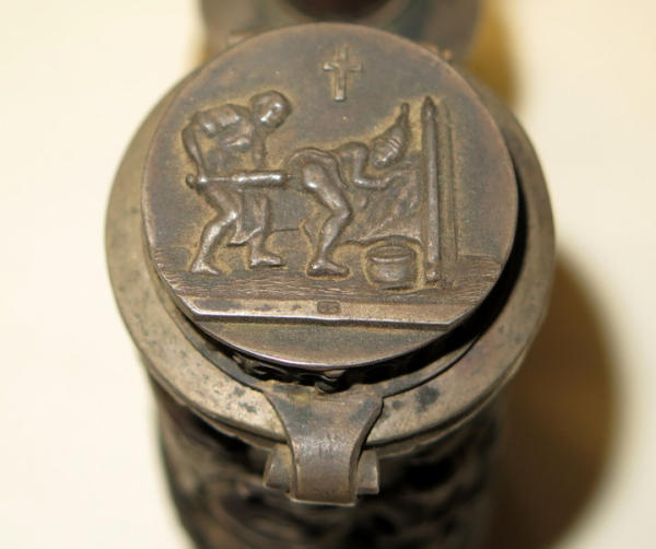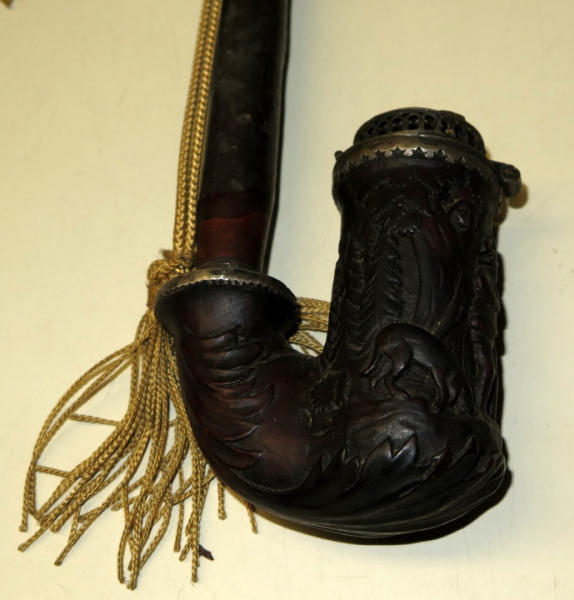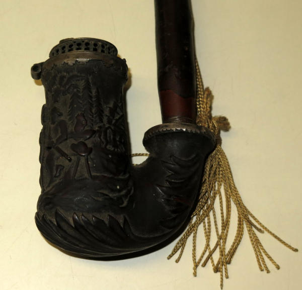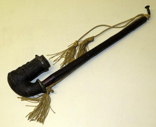 16.5" tall, wood carved, nice carving, the cap has a Dr giving a patient an Enema! Very unique piece