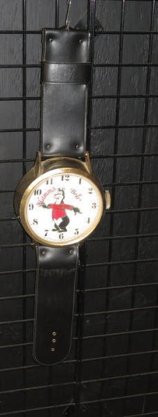 3' tall, 9" across, face is scratched up and missing the top buckle, believe it works, has wear