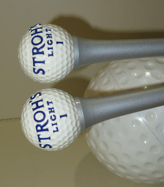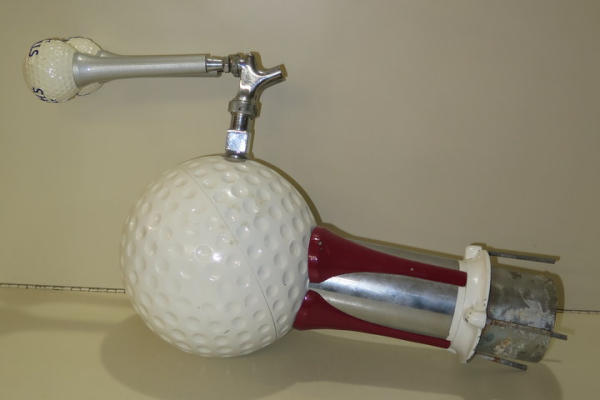 very unique piece, 2-spicket tap, about 21" tall, ball is about 9" across, heavy cast aluminum, includes two golf ball tap handles, neat piece for the golf nut!