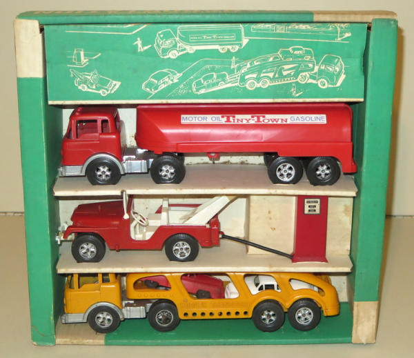 Toys are diecast cabs with plastic trailers, all toys are near mint, box has some light wear