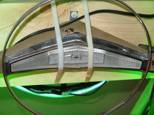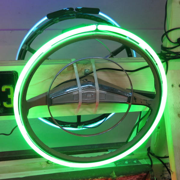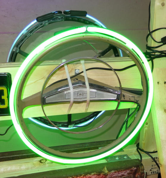 original used Steering wheel, looks like a 1960's era car, nice bright neon ring,