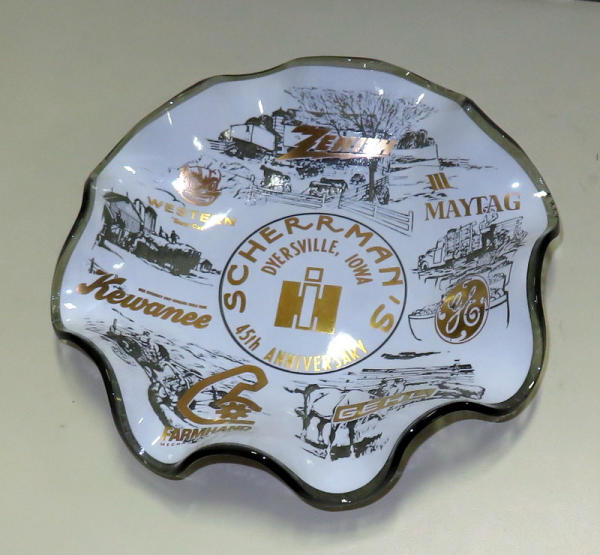 nice graphics, glass, advertises Maytag, GE, Gehl, Farmhand, Kewanee, Western Bobcat & Zenith; 7 1/2" dia.; has a couple small chips on the edges